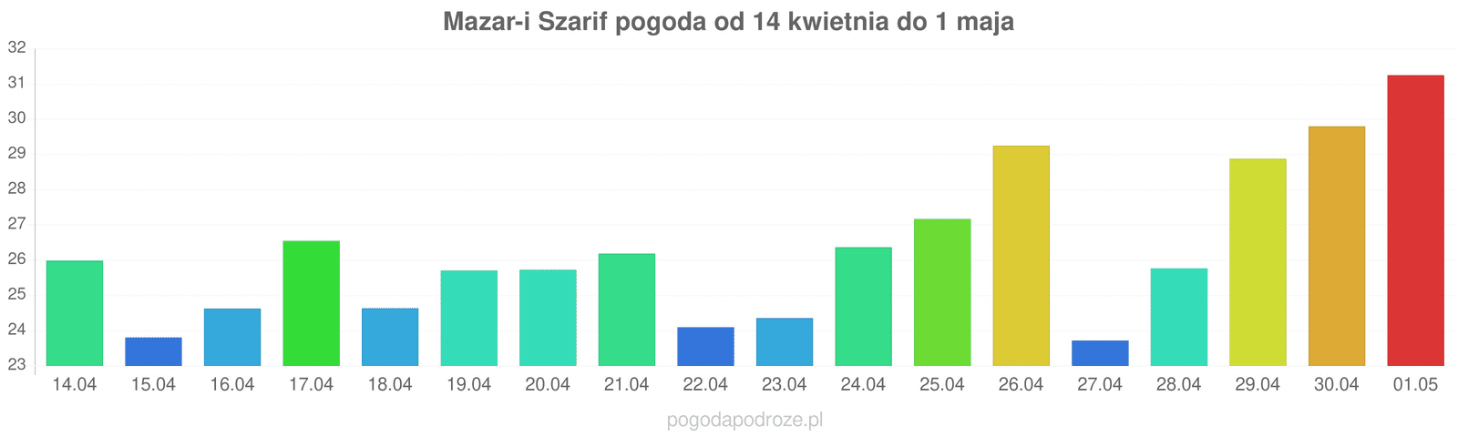 Według prognozy długoterminowej za tydzień w Mazar-i Szarif temperatura będzie spadać, w ciągu dnia można będzie obserwować temperatury około 24 stopnie.