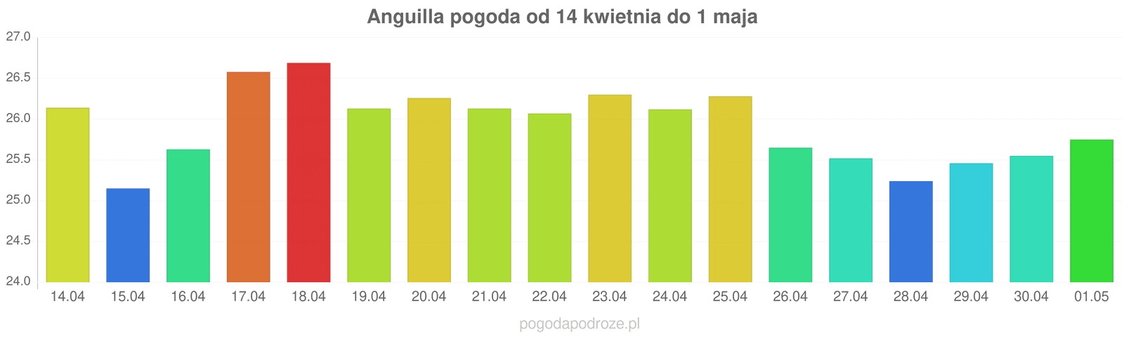 Jeśli wierzyć prognozom z odstępem czasu 7 dni to czeka nas dużo ciepła w Anguilli w przyszłym tygodniu. Temperatura w ciągu dnia osiągnie 26 stopni.