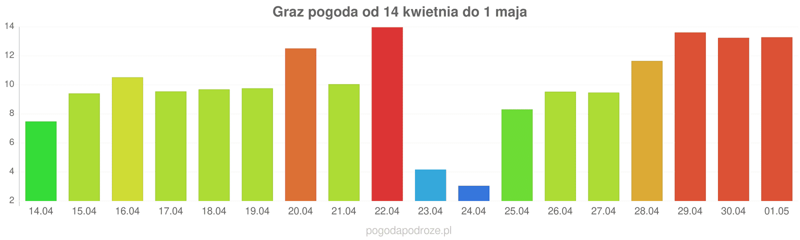 W nocy: 7℃Nad ranem: 3℃Wieczorem: 14℃słonecznieCiśnienie: 1016Wilgotność: 44%Wiatr: 2Zachmurzenie: 10%