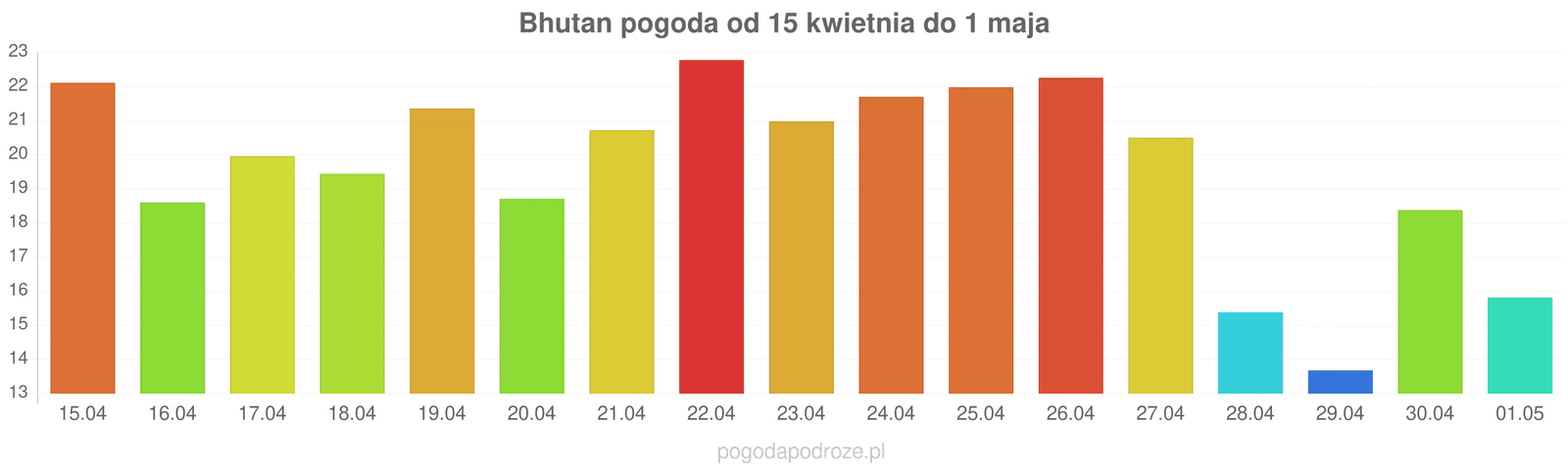 Według prognozy długoterminowej za tydzień w Bhutanie temperatura wzrośnie i będzie trochę cieplej, w ciągu dnia termometry bedą notowały około 21 stopni.