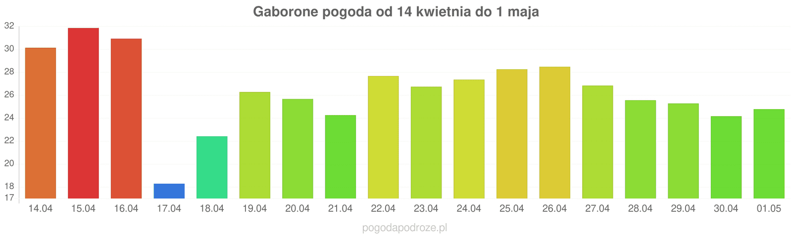 Jeśli damy wiarę prognozom z odstępem czasu 7 dni to czeka nas ochłodzenie w Gaborone w przyszłym tygodniu. Temperatura w ciągu dnia powinna spaść do 27 stopni.