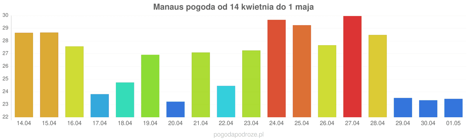 Jeśli damy wiarę prognozom z odstępem czasu 7 dni to czeka nas ochłodzenie w Manaus w przyszłym tygodniu. Temperatura w ciągu dnia powinna spaść do 27 stopni.