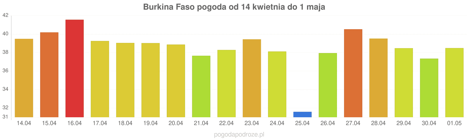 Jeśli damy wiarę prognozom z odstępem czasu 7 dni to czeka nas ochłodzenie w Burkina Faso w przyszłym tygodniu. Temperatura w ciągu dnia powinna spaść do 39 stopni.