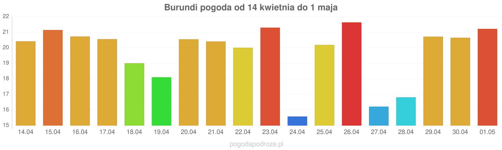 Według prognozy długoterminowej za tydzień w Burundi temperatura wzrośnie i będzie trochę cieplej, w ciągu dnia termometry bedą notowały około 21 stopni.