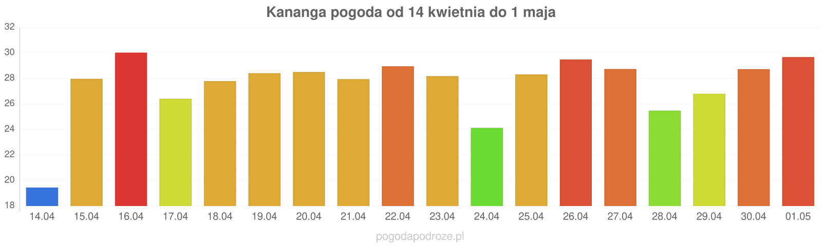 Jeśli damy wiarę prognozom z odstępem czasu 7 dni to czeka nas ochłodzenie w Kananga w przyszłym tygodniu. Temperatura w ciągu dnia powinna spaść do 28 stopni.