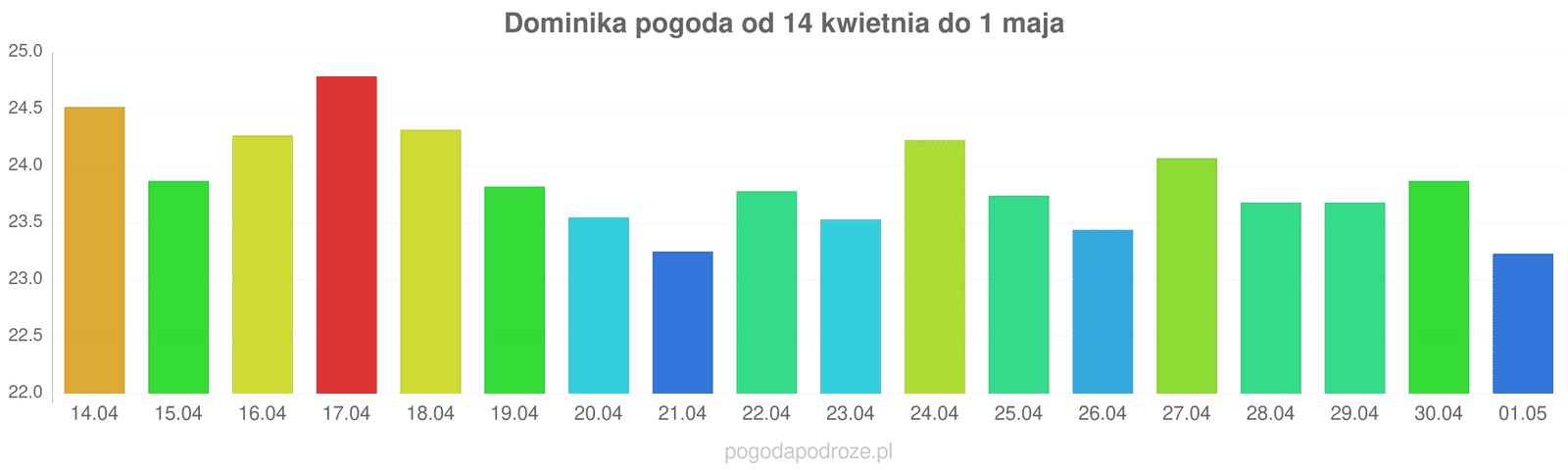 Według prognozy długoterminowej za tydzień na Dominice temperatura będzie spadać, w ciągu dnia można będzie obserwować temperatury około 24 stopnie.