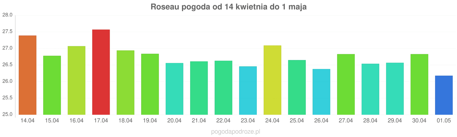 Jeśli damy wiarę prognozom z odstępem czasu 7 dni to czeka nas ochłodzenie w Roseau w przyszłym tygodniu. Temperatura w ciągu dnia powinna spaść do 26 stopni.