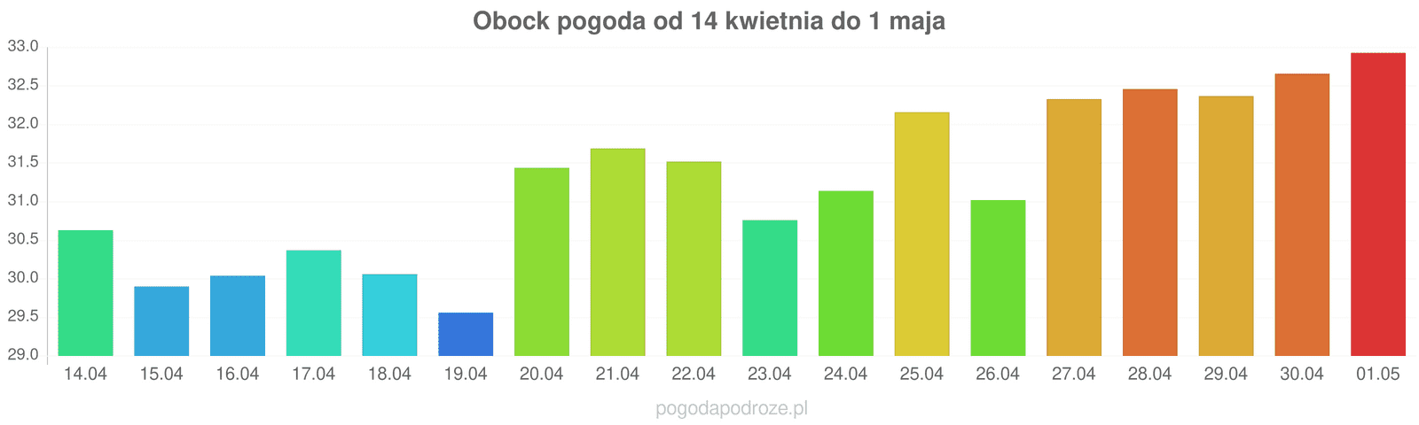 Jeśli wierzyć prognozom z odstępem czasu 7 dni to czeka nas dużo ciepła w Obock w przyszłym tygodniu. Temperatura w ciągu dnia osiągnie 31 stopni.