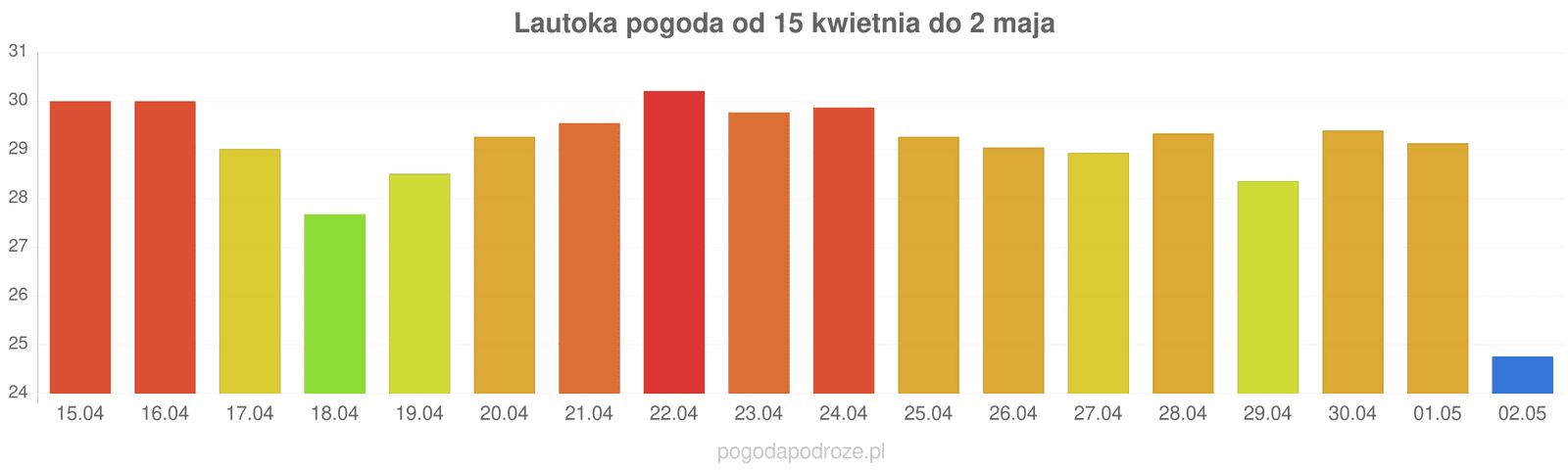 Jeśli damy wiarę prognozom z odstępem czasu 7 dni to czeka nas ochłodzenie w Lautoka w przyszłym tygodniu. Temperatura w ciągu dnia powinna spaść do 30 stopni.