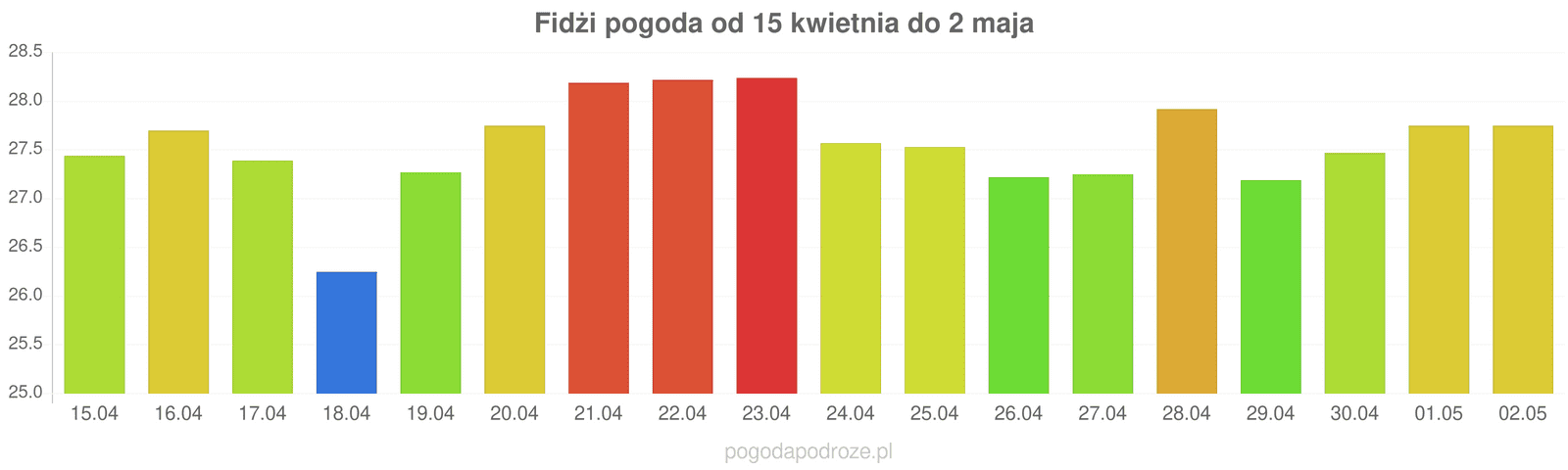 Jeśli wierzyć prognozom z odstępem czasu 7 dni to czeka nas dużo ciepła w Fidżi w przyszłym tygodniu. Temperatura w ciągu dnia osiągnie 28 stopni.
