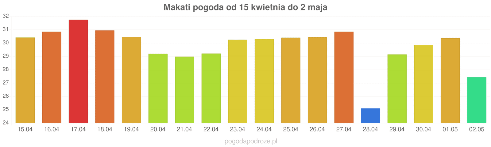 Jeśli damy wiarę prognozom z odstępem czasu 7 dni to czeka nas ochłodzenie w Makati w przyszłym tygodniu. Temperatura w ciągu dnia powinna spaść do 30 stopni.