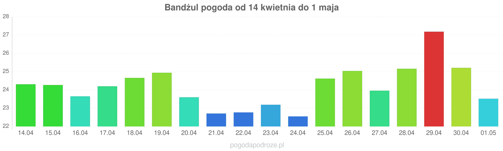 Według prognozy długoterminowej za tydzień w Banjul temperatura będzie spadać, w ciągu dnia można będzie obserwować temperatury około 23 stopnie.