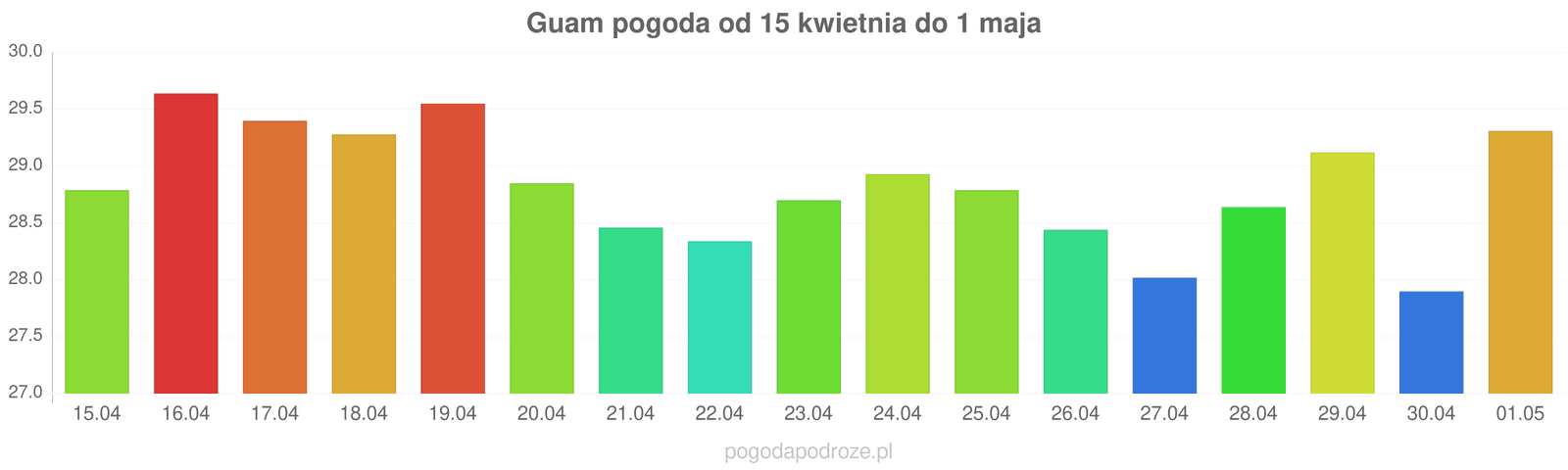 W przypadku dnia jutrzejszego można mówić o spadku temperatury w Guam. Słupek termometry spadnie i wyniesie w ciągu dnia 29 stopni.