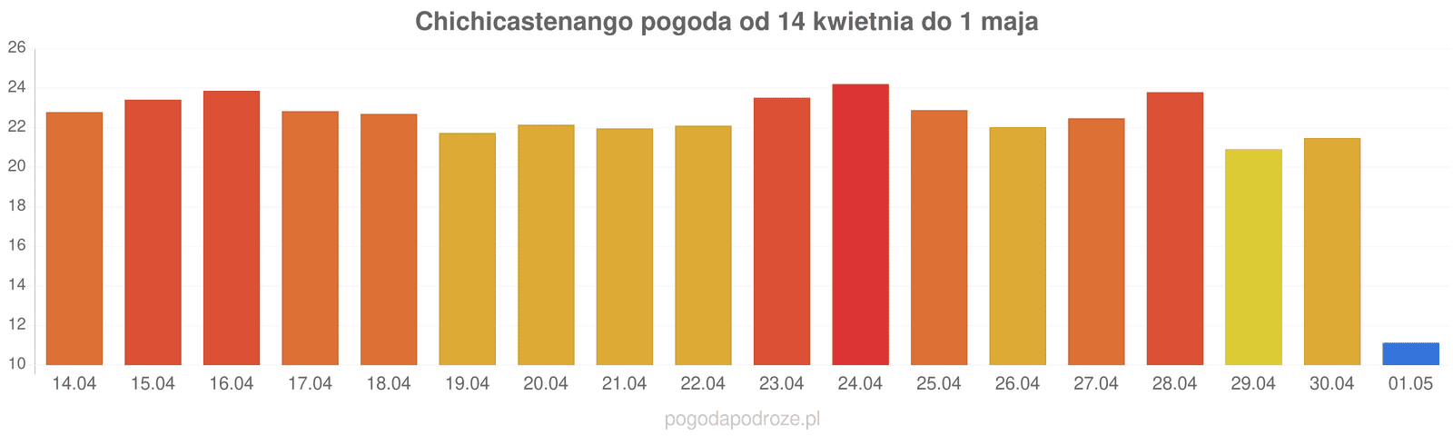 Według prognozy długoterminowej za tydzień w Chichicastenango temperatura będzie spadać, w ciągu dnia można będzie obserwować temperatury około 24 stopnie.