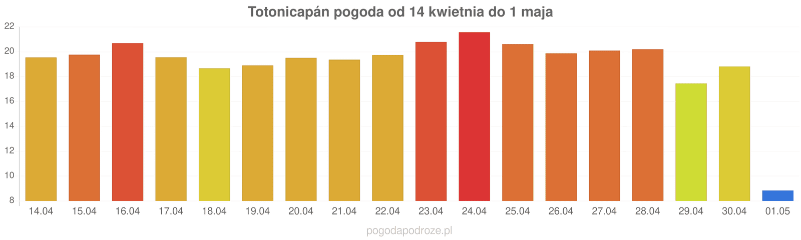 Według prognozy długoterminowej za tydzień w Totonicapán temperatura wzrośnie i będzie trochę cieplej, w ciągu dnia termometry bedą notowały około 21 stopni.