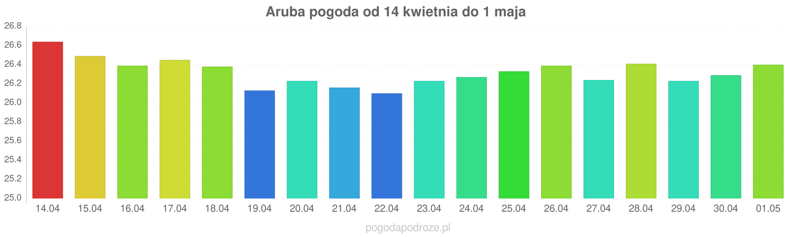 Jeśli damy wiarę prognozom z odstępem czasu 7 dni to czeka nas ochłodzenie w Arubie w przyszłym tygodniu. Temperatura w ciągu dnia powinna spaść do 26 stopni.