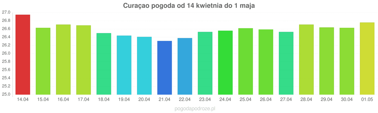 Jeśli damy wiarę prognozom z odstępem czasu 7 dni to czeka nas ochłodzenie w Curacao w przyszłym tygodniu. Temperatura w ciągu dnia powinna spaść do 27 stopni.