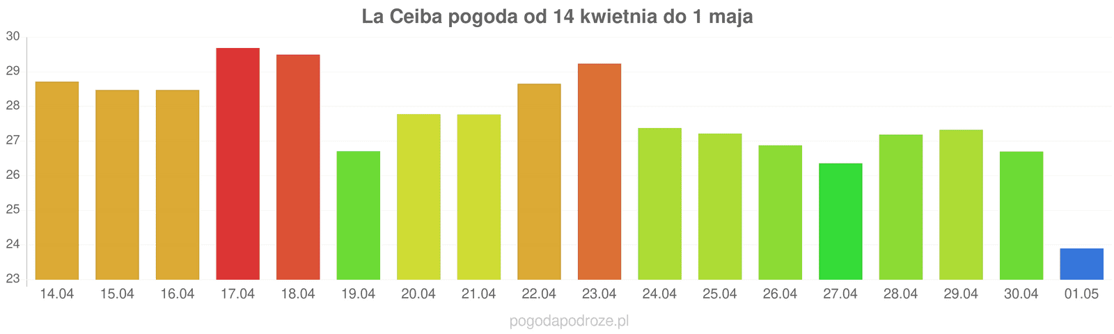Jeśli wierzyć prognozom z odstępem czasu 7 dni to czeka nas dużo ciepła w La Ceiba w przyszłym tygodniu. Temperatura w ciągu dnia osiągnie 29 stopni.