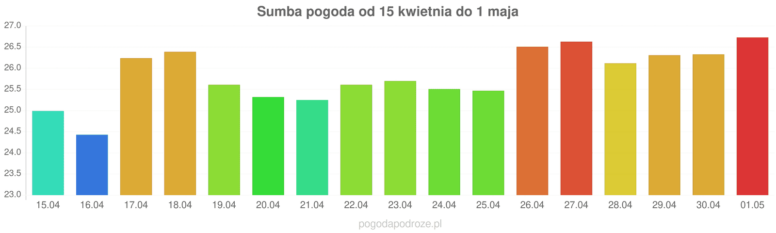 Według prognozy długoterminowej za tydzień w Sumba temperatura wzrośnie i będzie trochę cieplej, w ciągu dnia termometry bedą notowały około 26 stopni.