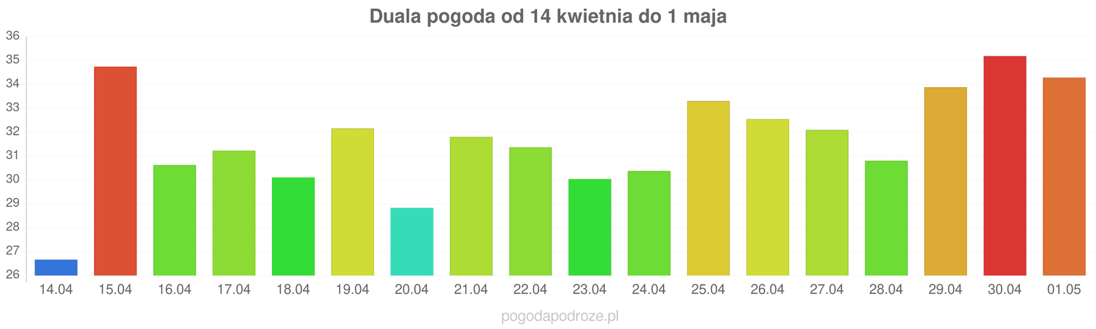 Jeśli damy wiarę prognozom z odstępem czasu 7 dni to czeka nas ochłodzenie w Douala w przyszłym tygodniu. Temperatura w ciągu dnia powinna spaść do 30 stopni.