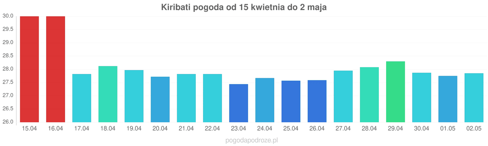 Jeśli damy wiarę prognozom z odstępem czasu 7 dni to czeka nas ochłodzenie na Kiribati w przyszłym tygodniu. Temperatura w ciągu dnia powinna spaść do 27 stopni.