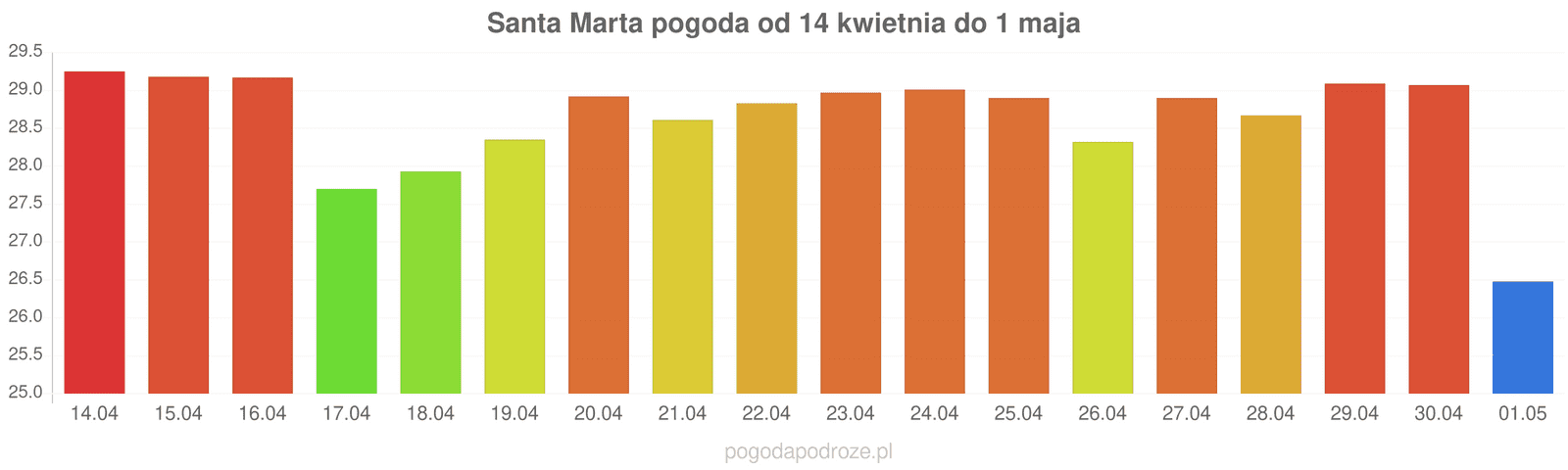 Jeśli damy wiarę prognozom z odstępem czasu 7 dni to czeka nas ochłodzenie w Santa Marta w przyszłym tygodniu. Temperatura w ciągu dnia powinna spaść do 29 stopni.