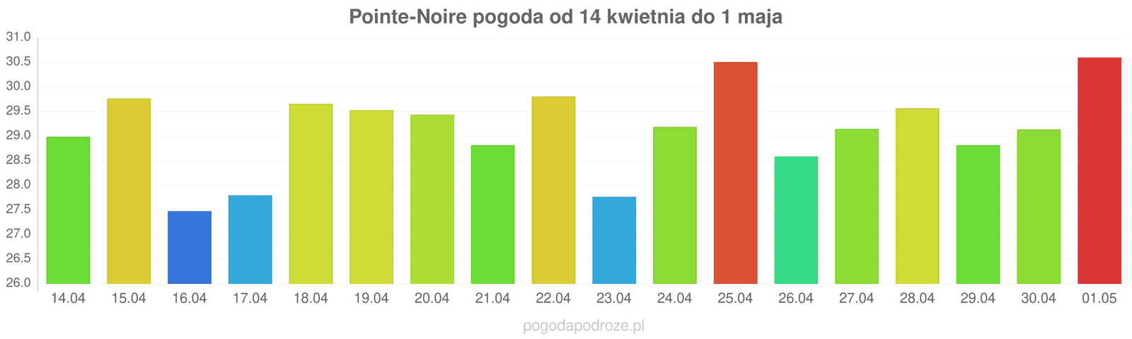 Jeśli wierzyć prognozom z odstępem czasu 7 dni to czeka nas dużo ciepła w Pointe-Noire w przyszłym tygodniu. Temperatura w ciągu dnia osiągnie 28 stopni.