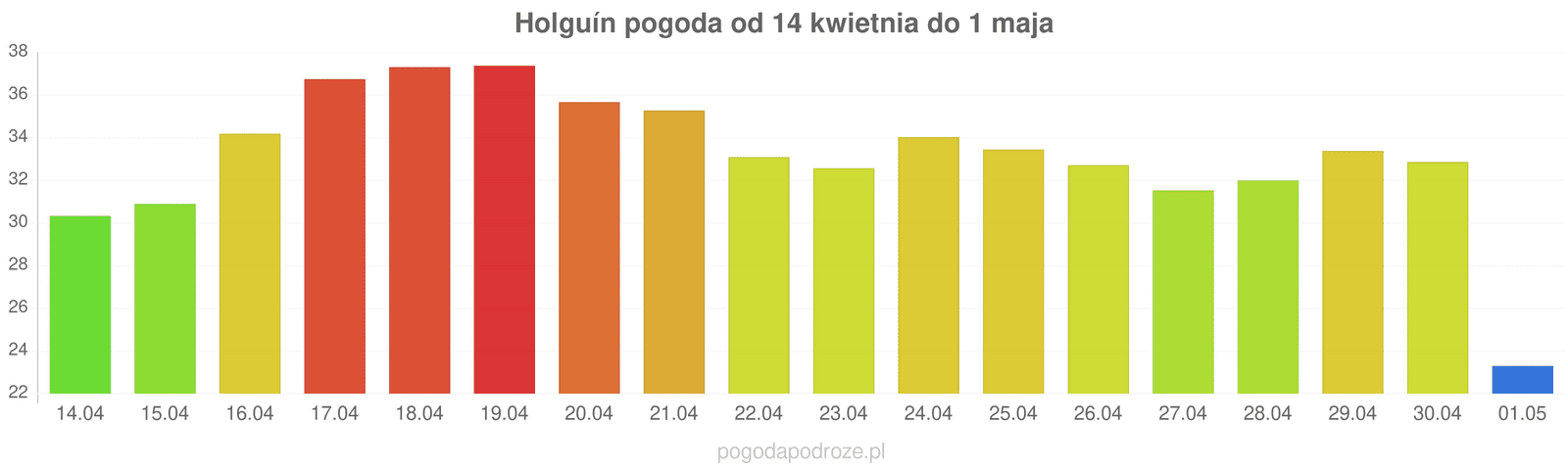 Jeśli damy wiarę prognozom z odstępem czasu 7 dni to czeka nas ochłodzenie w Holguin w przyszłym tygodniu. Temperatura w ciągu dnia powinna spaść do 33 stopni.