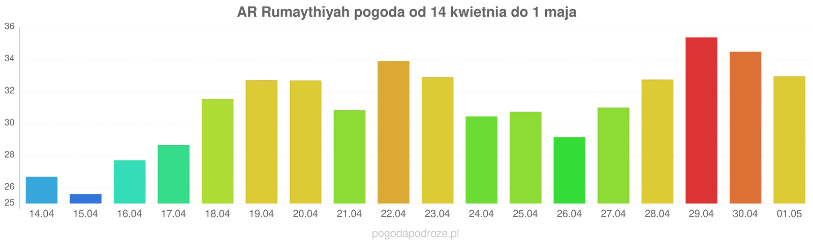 Jeśli wierzyć prognozom z odstępem czasu 7 dni to czeka nas dużo ciepła w AR Rumaythīyah w przyszłym tygodniu. Temperatura w ciągu dnia osiągnie 33 stopnie.