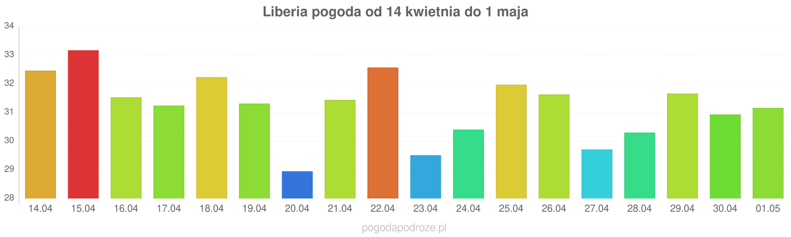 Jeśli damy wiarę prognozom z odstępem czasu 7 dni to czeka nas ochłodzenie w Liberii w przyszłym tygodniu. Temperatura w ciągu dnia powinna spaść do 30 stopni.