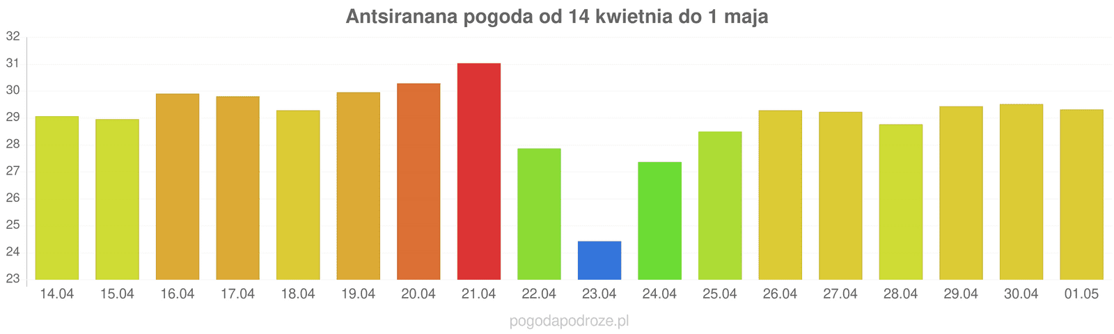 Jeśli damy wiarę prognozom z odstępem czasu 7 dni to czeka nas ochłodzenie w Antsiranana w przyszłym tygodniu. Temperatura w ciągu dnia powinna spaść do 24 stopni.