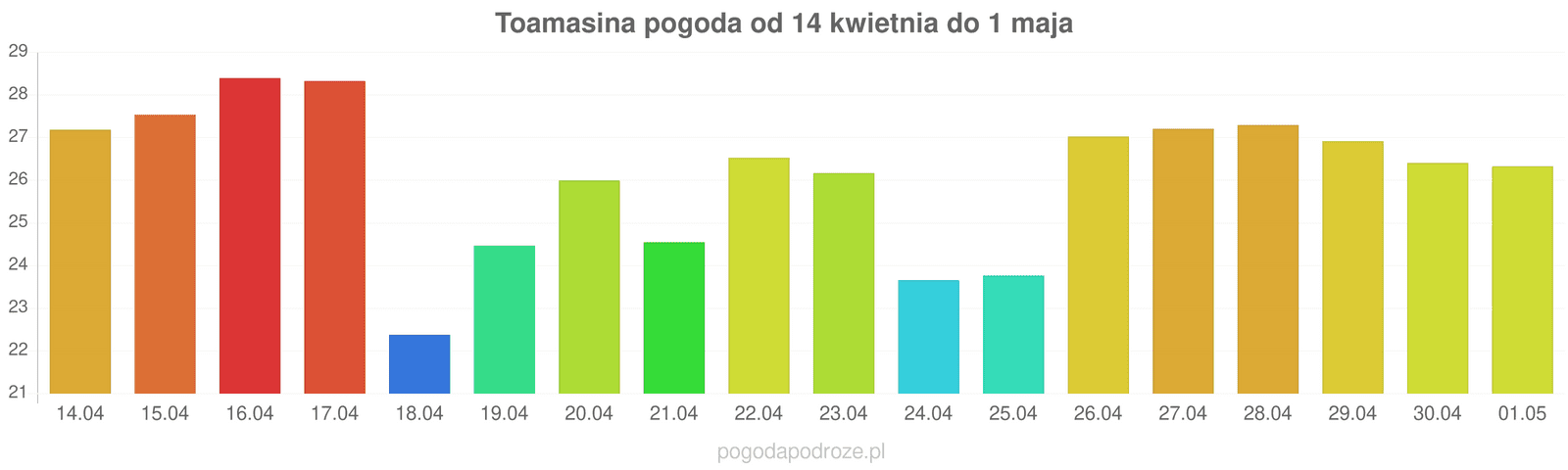 Jeśli damy wiarę prognozom z odstępem czasu 7 dni to czeka nas ochłodzenie w Toamasina w przyszłym tygodniu. Temperatura w ciągu dnia powinna spaść do 26 stopni.