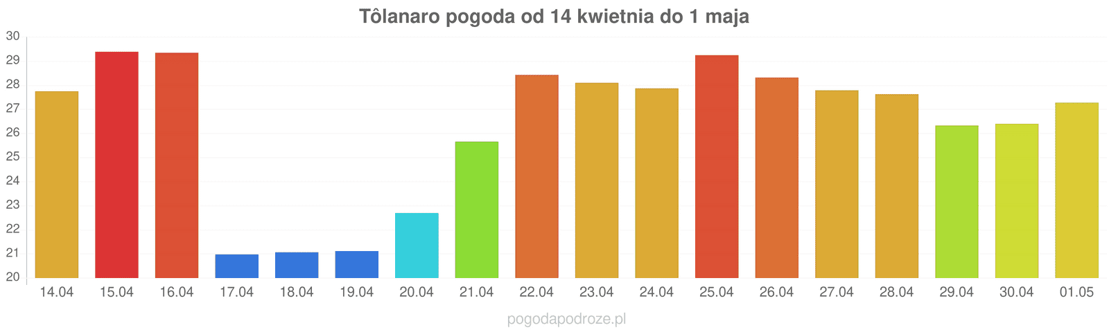 Jeśli damy wiarę prognozom z odstępem czasu 7 dni to czeka nas ochłodzenie w Tôlanaro w przyszłym tygodniu. Temperatura w ciągu dnia powinna spaść do 28 stopni.