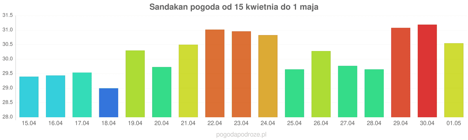 Jeśli wierzyć prognozom z odstępem czasu 7 dni to czeka nas dużo ciepła w Sandakan w przyszłym tygodniu. Temperatura w ciągu dnia osiągnie 31 stopni.