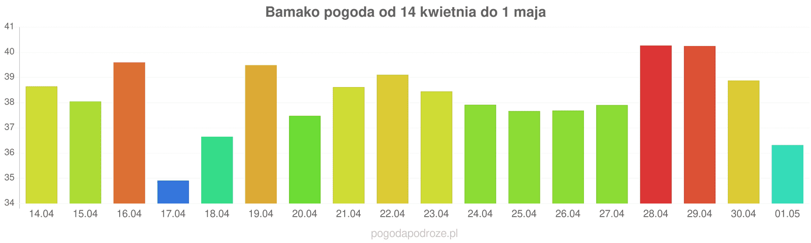 Jeśli damy wiarę prognozom z odstępem czasu 7 dni to czeka nas ochłodzenie w Bamako w przyszłym tygodniu. Temperatura w ciągu dnia powinna spaść do 38 stopni.