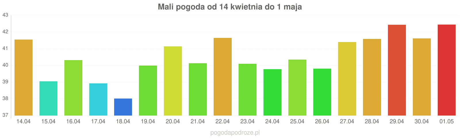 Jeśli damy wiarę prognozom z odstępem czasu 7 dni to czeka nas ochłodzenie w Mali w przyszłym tygodniu. Temperatura w ciągu dnia powinna spaść do 40 stopni.