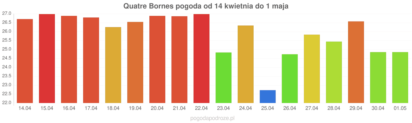 Jeśli damy wiarę prognozom z odstępem czasu 7 dni to czeka nas ochłodzenie w Quatre Bornes w przyszłym tygodniu. Temperatura w ciągu dnia powinna spaść do 25 stopni.