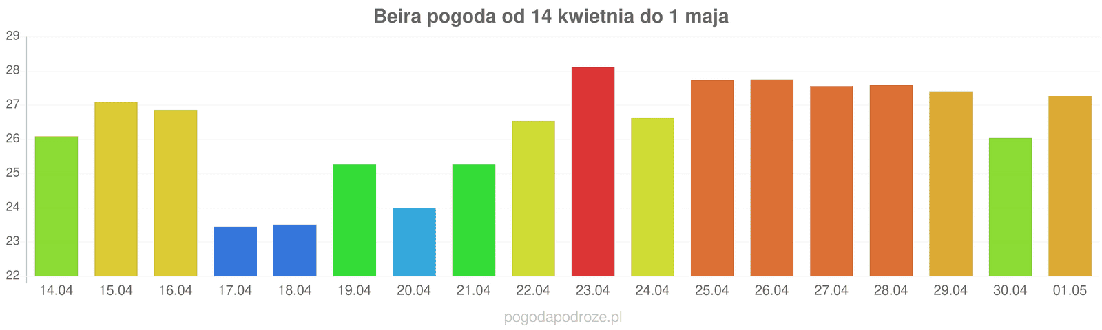 Jeśli wierzyć prognozom z odstępem czasu 7 dni to czeka nas dużo ciepła w Beira w przyszłym tygodniu. Temperatura w ciągu dnia osiągnie 28 stopni.