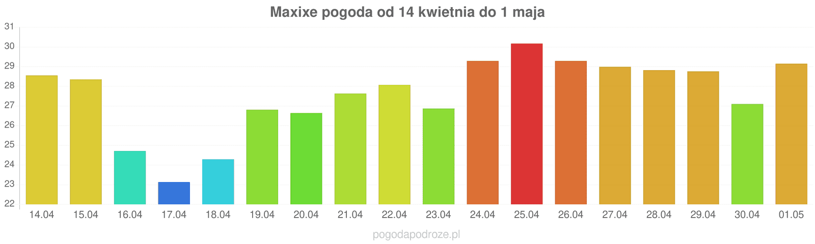 Według prognozy długoterminowej za tydzień w Maxixe temperatura wzrośnie i będzie trochę cieplej, w ciągu dnia termometry bedą notowały około 27 stopni.