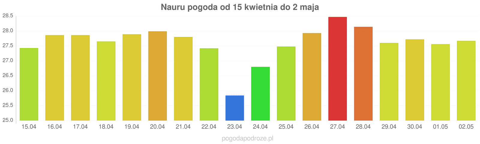 Jeśli damy wiarę prognozom z odstępem czasu 7 dni to czeka nas ochłodzenie w Nauru w przyszłym tygodniu. Temperatura w ciągu dnia powinna spaść do 26 stopni.