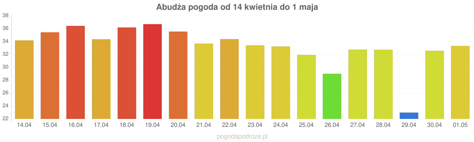 Jeśli damy wiarę prognozom z odstępem czasu 7 dni to czeka nas ochłodzenie w Abudża w przyszłym tygodniu. Temperatura w ciągu dnia powinna spaść do 33 stopni.