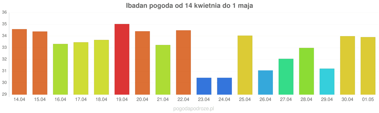 Jeśli damy wiarę prognozom z odstępem czasu 7 dni to czeka nas ochłodzenie w Ibadan w przyszłym tygodniu. Temperatura w ciągu dnia powinna spaść do 30 stopni.