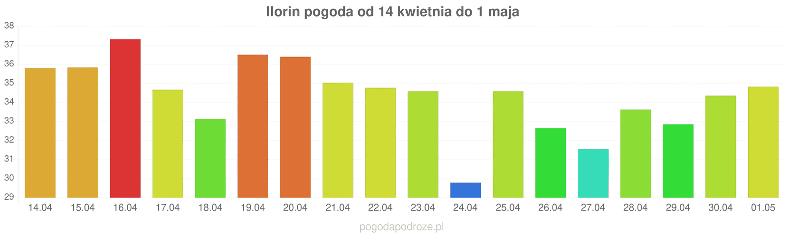 Jeśli damy wiarę prognozom z odstępem czasu 7 dni to czeka nas ochłodzenie w Ilorin w przyszłym tygodniu. Temperatura w ciągu dnia powinna spaść do 35 stopni.