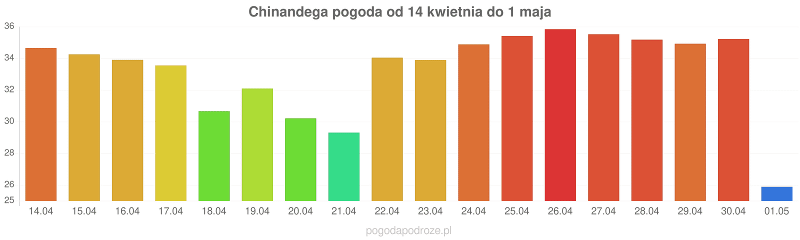 Jeśli damy wiarę prognozom z odstępem czasu 7 dni to czeka nas ochłodzenie w Chinandega w przyszłym tygodniu. Temperatura w ciągu dnia powinna spaść do 34 stopni.