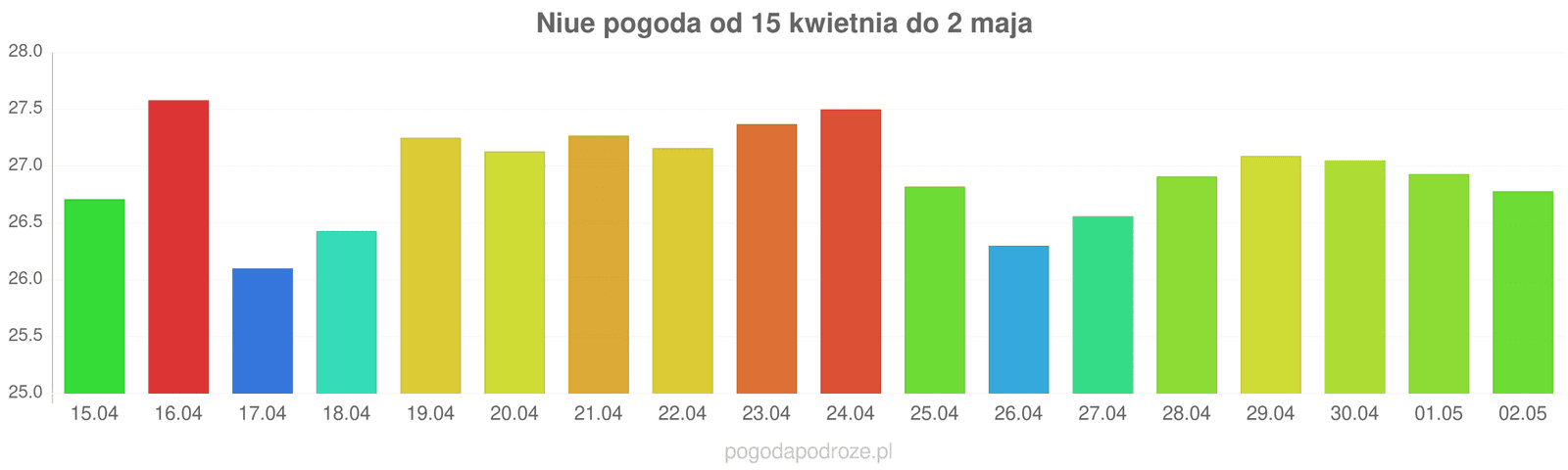 Jeśli damy wiarę prognozom z odstępem czasu 7 dni to czeka nas ochłodzenie w Niue w przyszłym tygodniu. Temperatura w ciągu dnia powinna spaść do 27 stopni.