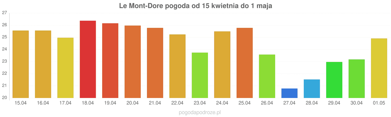 Jeśli damy wiarę prognozom z odstępem czasu 7 dni to czeka nas ochłodzenie w Le Mont-Dore w przyszłym tygodniu. Temperatura w ciągu dnia powinna spaść do 24 stopni.