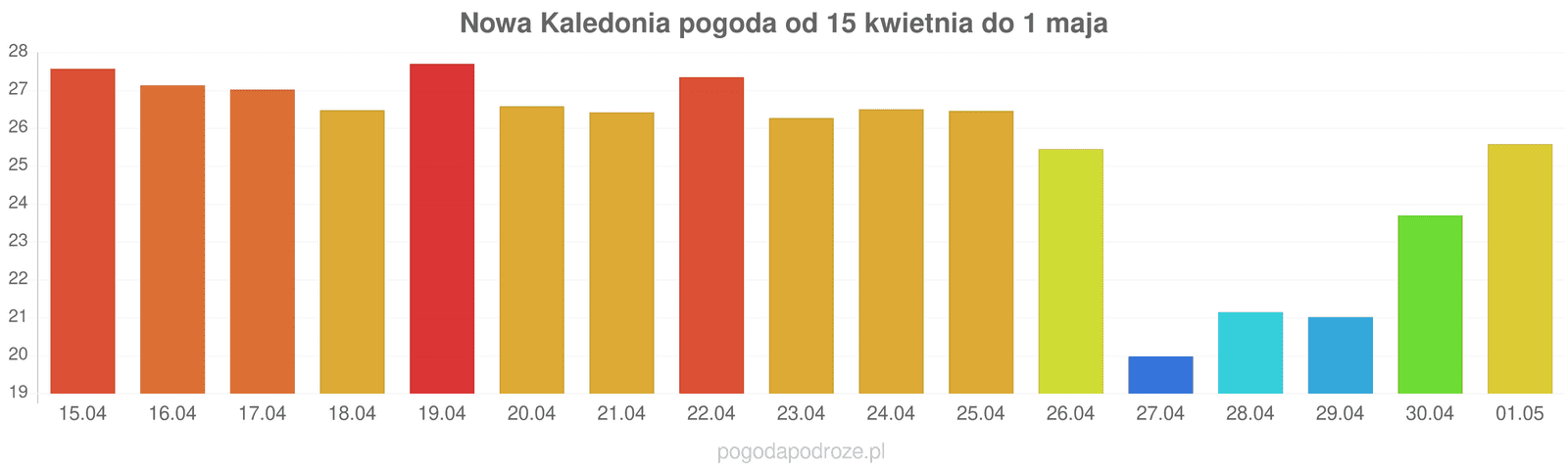 Jeśli damy wiarę prognozom z odstępem czasu 7 dni to czeka nas ochłodzenie w Nowa Kaledonia w przyszłym tygodniu. Temperatura w ciągu dnia powinna spaść do 26 stopni.