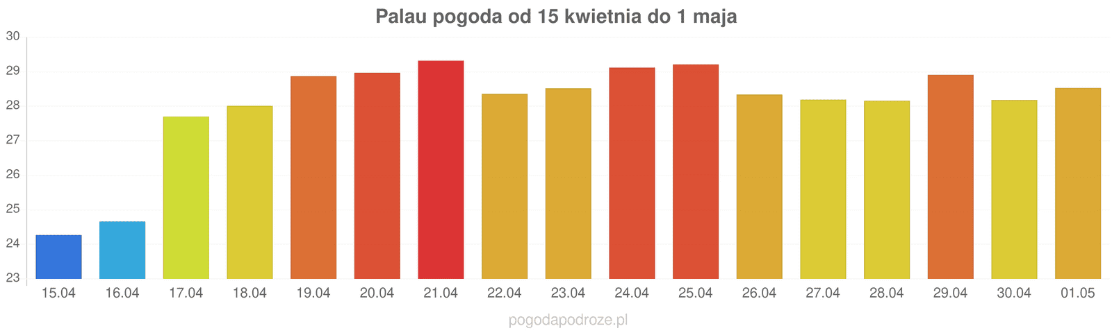 Według prognozy długoterminowej za tydzień w Palau temperatura wzrośnie i będzie trochę cieplej, w ciągu dnia termometry bedą notowały około 29 stopni.