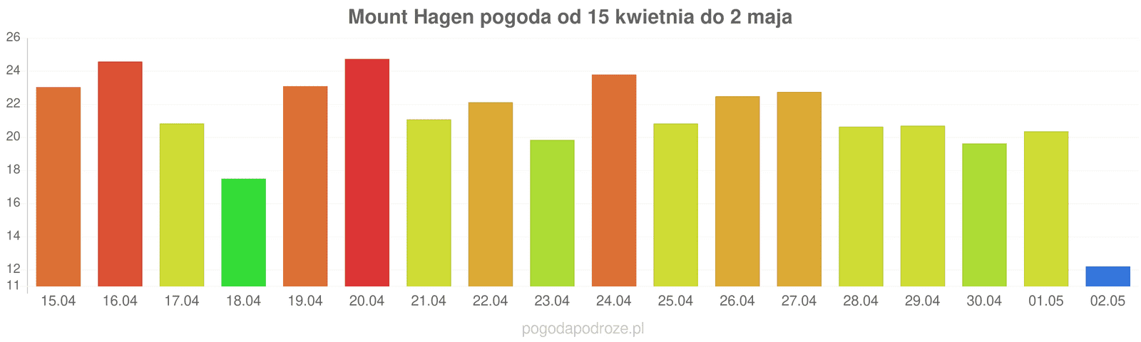 Według prognozy długoterminowej za tydzień w Mount Hagen temperatura będzie spadać, w ciągu dnia można będzie obserwować temperatury około 20 stopni.