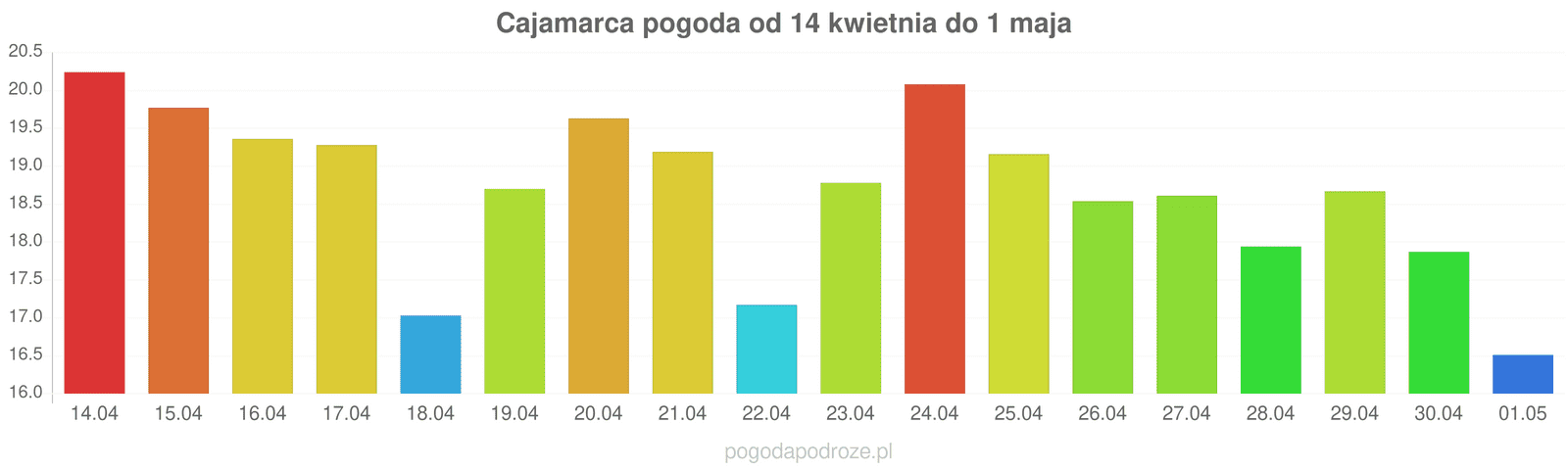 Według prognozy długoterminowej za tydzień w Cajamarca temperatura będzie spadać, w ciągu dnia można będzie obserwować temperatury około 19 stopni.